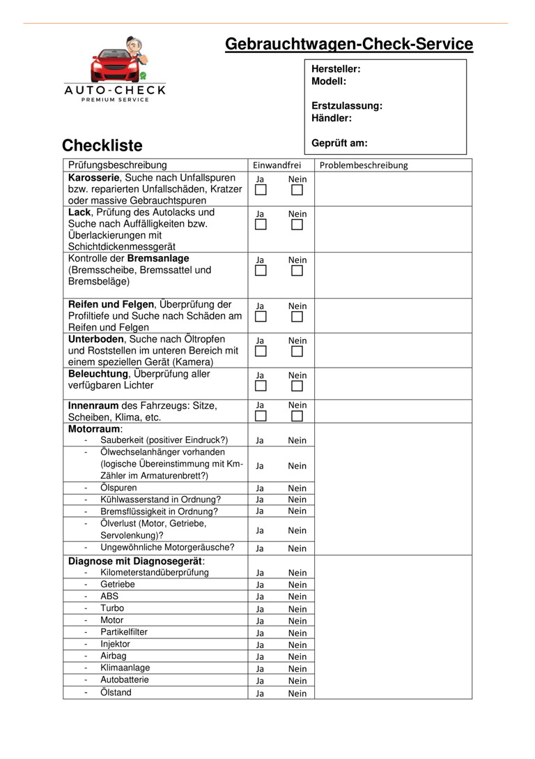 - Fehlererkennung: Eine detaillierte Überprüfung ermöglicht es, mechanische oder elektronische Probleme des Autos zu erkennen. Dies ist entscheidend, um teure Reparaturen nach dem Kauf zu vermeiden.